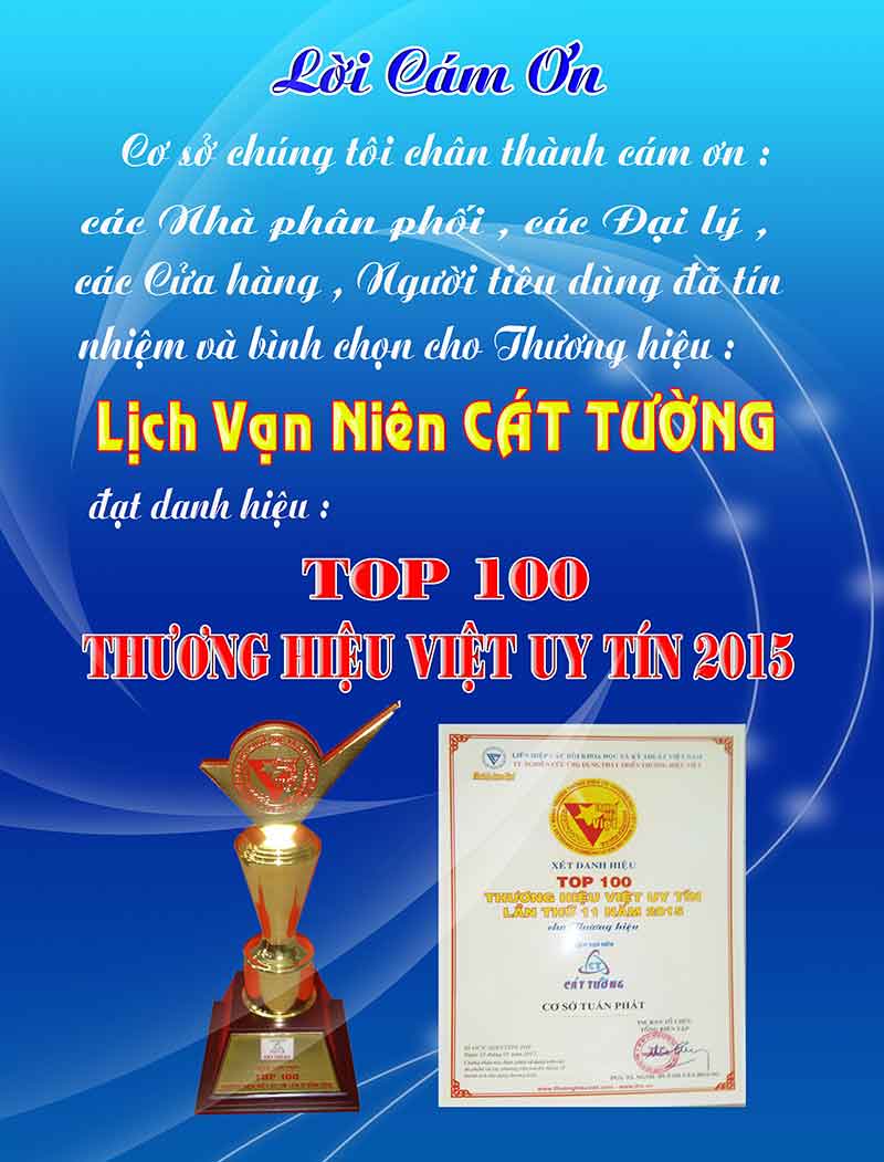 Cơ sở lịch vạn niên CÁT TƯỜNG xin chân thành cảm ơn các Nhà Đại Lý phân phối, các Cửa Hàng, Người tiêu dùng đã tín nhiệm và bình chọn Thương Hiệu Lịch Vạn Niên CÁT TƯỜNG của Cơ Sở chúng tôi đạt danh hiệu: